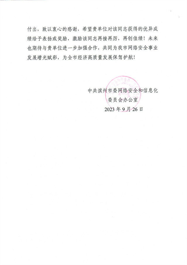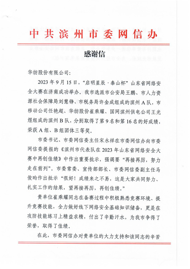 近日,公司收到一封來自濱州市委網信辦的感謝信,信中高度肯定了公司互聯信息部信息中心信息安全管理員崔乘耀在2023年9月15日“啟明星辰·泰山杯”山東省網絡安全大賽中所做出的突出貢獻,信中指出:“貴單位崔乘耀同志在備賽過程中積極熟悉競賽環境、提升競賽技能,全力做好線下網絡安全基礎知識儲備,更是在攻防技能練習上精益求精,付出了辛勤汗水,為我市爭得了榮譽,取得了佳績。”