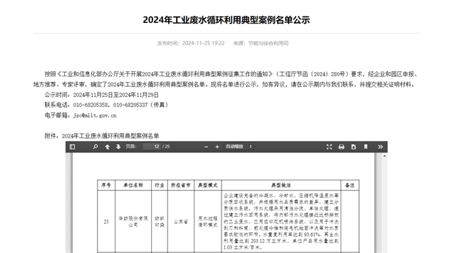 導讀:近日,工業和信息化部發布了2024年工業廢水循環利用典型案例名單,含58個工業廢水循環利用典型案例。公司用水過程循環模式成功入選名單,水重復利用率達到93.61%;再生水利用量達到